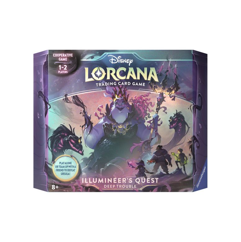 – 2 kant-en-klare 60 kaarten decks. – 1 Ursula scenario deck van 50 kaarten. – 1 oversized Ursula kaart. – 2 oversized, double-sided battleground kaarten. – 1 Deep Trouble playmat. – 1 Ursula draw token. – 3 Lore tracker tokens. – 29 damage counters. – 1 geheime overwinnings kaart. – 1 sheet met uitleg over de Illumineer’s Quest